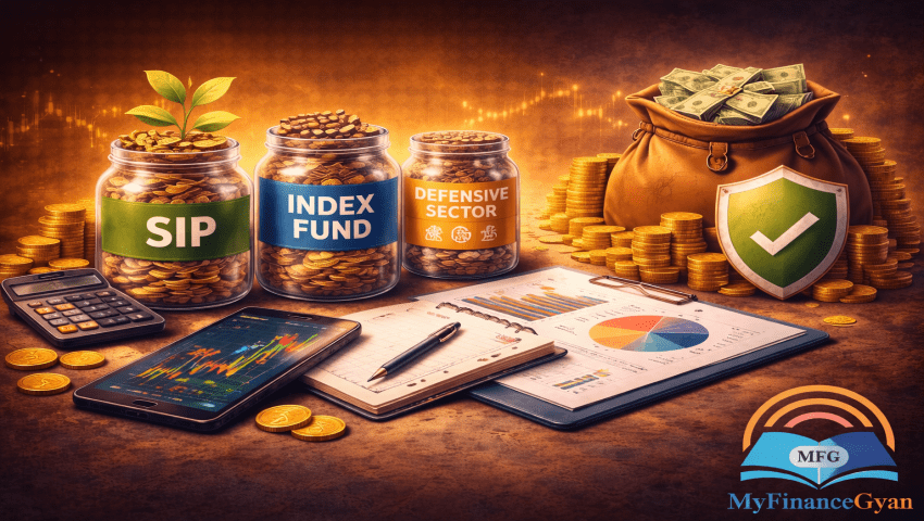 SIPs help average investment costs, index funds deliver broad and low-cost market exposure, and defensive sectors provide relative stability when markets turn uncertain.